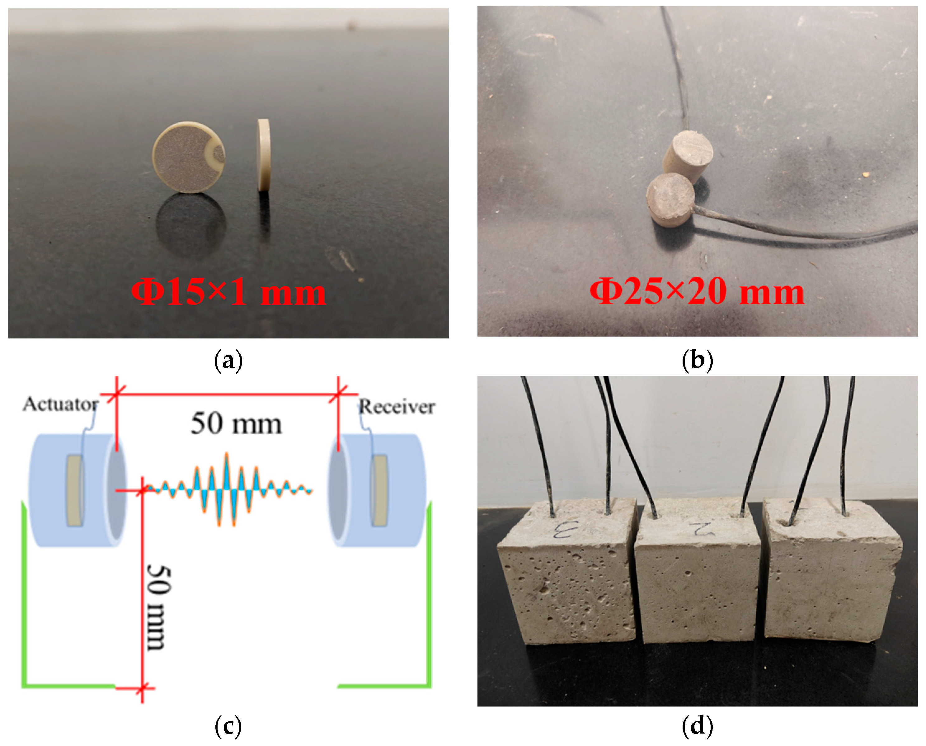 - Jiang, S.; Yang, J.T.; Hu, J.X.; Lu, G.Y. Early-age mortar and concrete strength monitoring using embedded smart piezoelectric module based on wave propagation technique. Measurement 2025, 247, 116789. [Google Scholar] [CrossRef]
