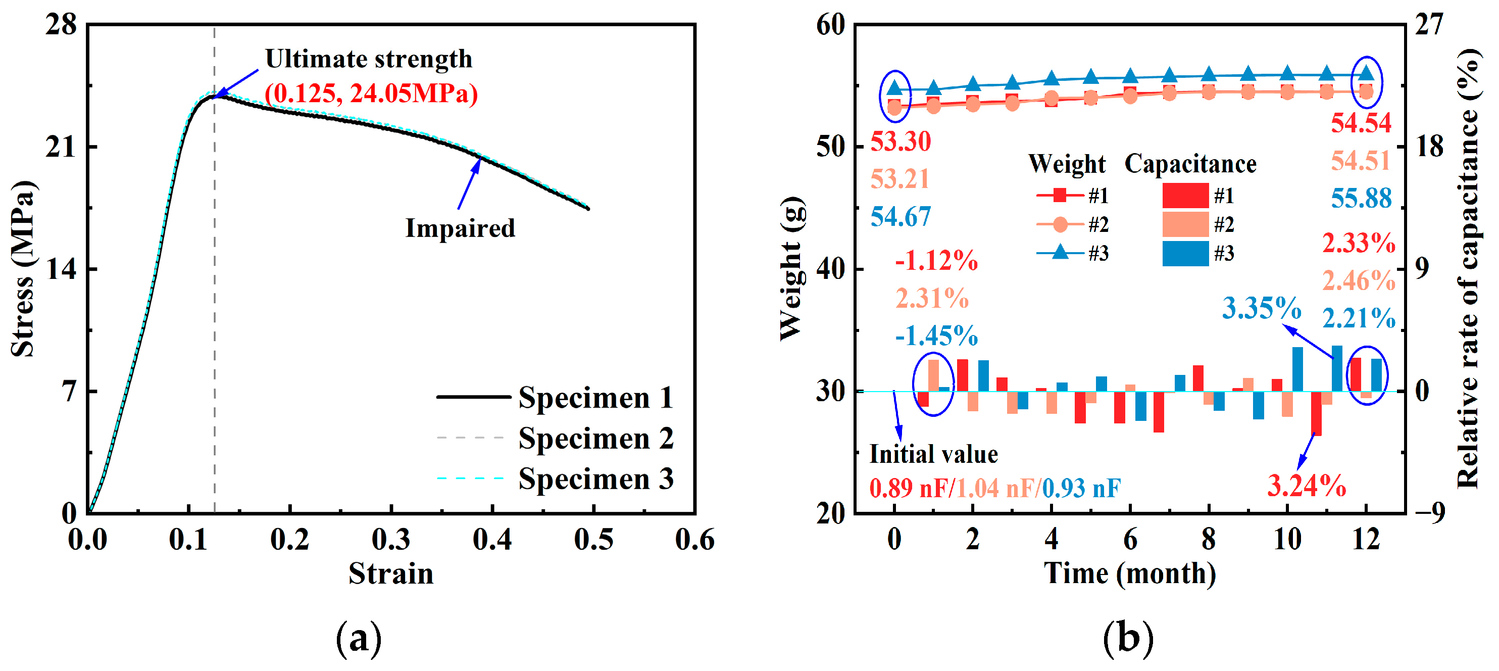 - The comprehensive performance evaluation of the piezoelectric ultrasonic sensors indicates that, due to encapsulation processes and interfacial effects, their capacitance values gradually decrease during successive encapsulation steps and eventually stabilize. The mechanical loading tests revealed a maximum load-bearing capacity of 24.05 MPa, providing critical experimental evidence for structural encapsulation design. Long-term water immersion tests showed that although the sensor mass increased slightly over time, the capacitance variation consistently remained within ±4%, demonstrating excellent electrical stability and waterproof performance. Overall, the sensors exhibited robust stability and reliability under diverse environmental conditions, providing strong experimental support for their potential use in future studies of structural monitoring.