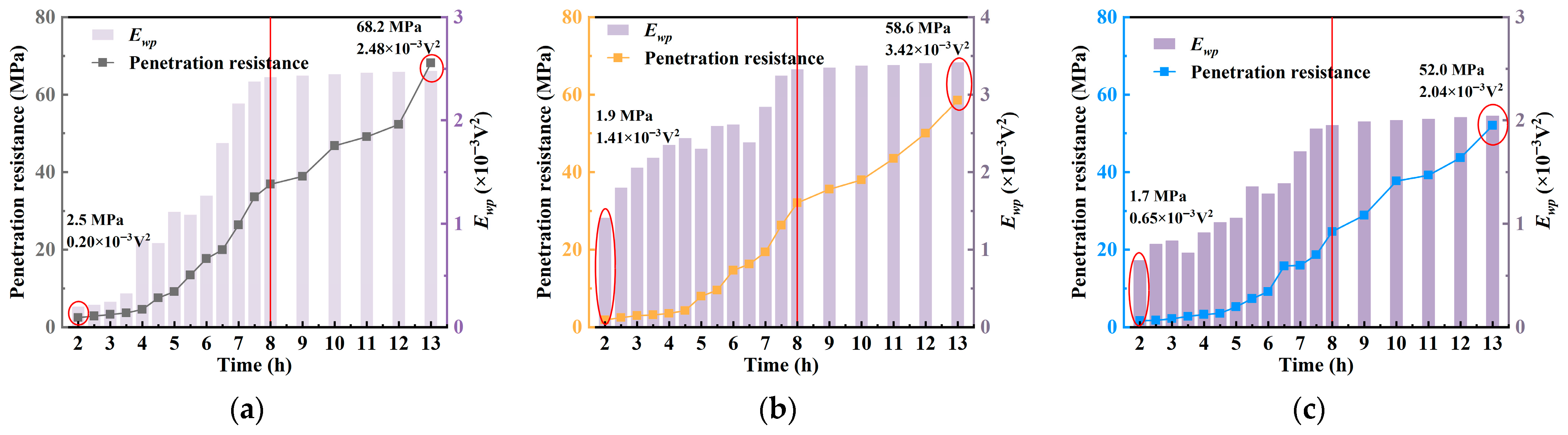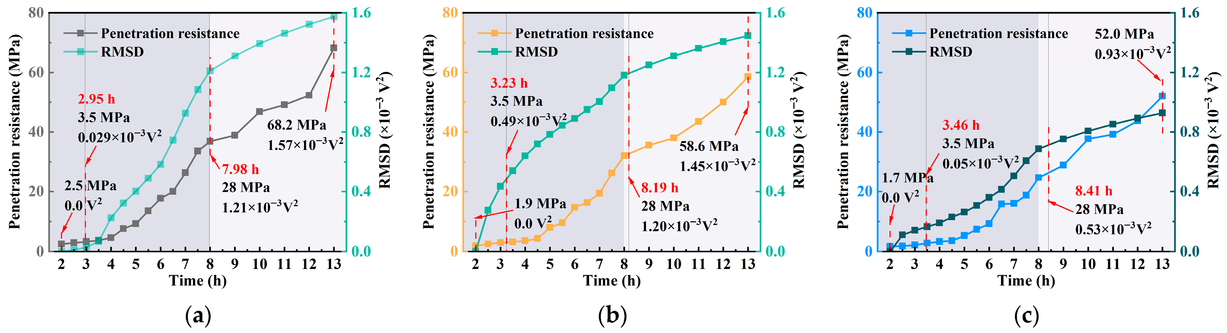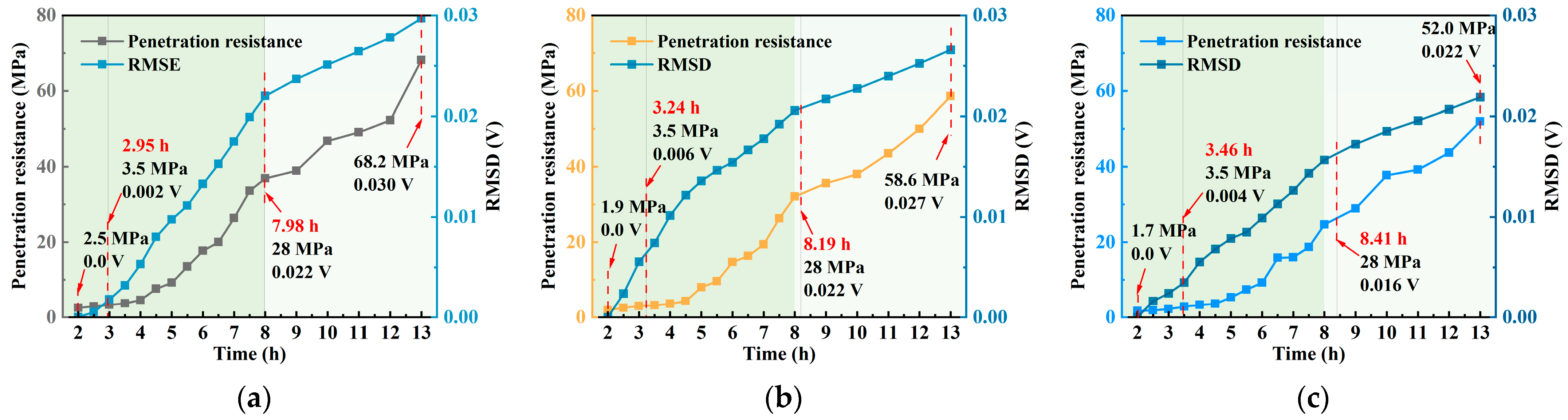 Time (h) | Penetration Resistance (MPa) | Amplitude (V) | ||||