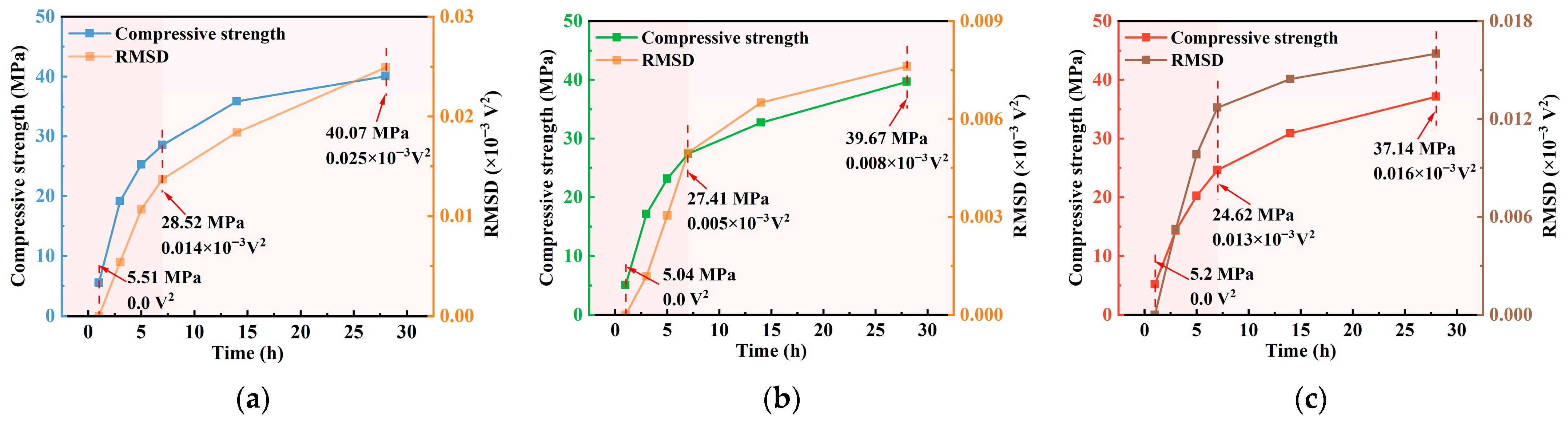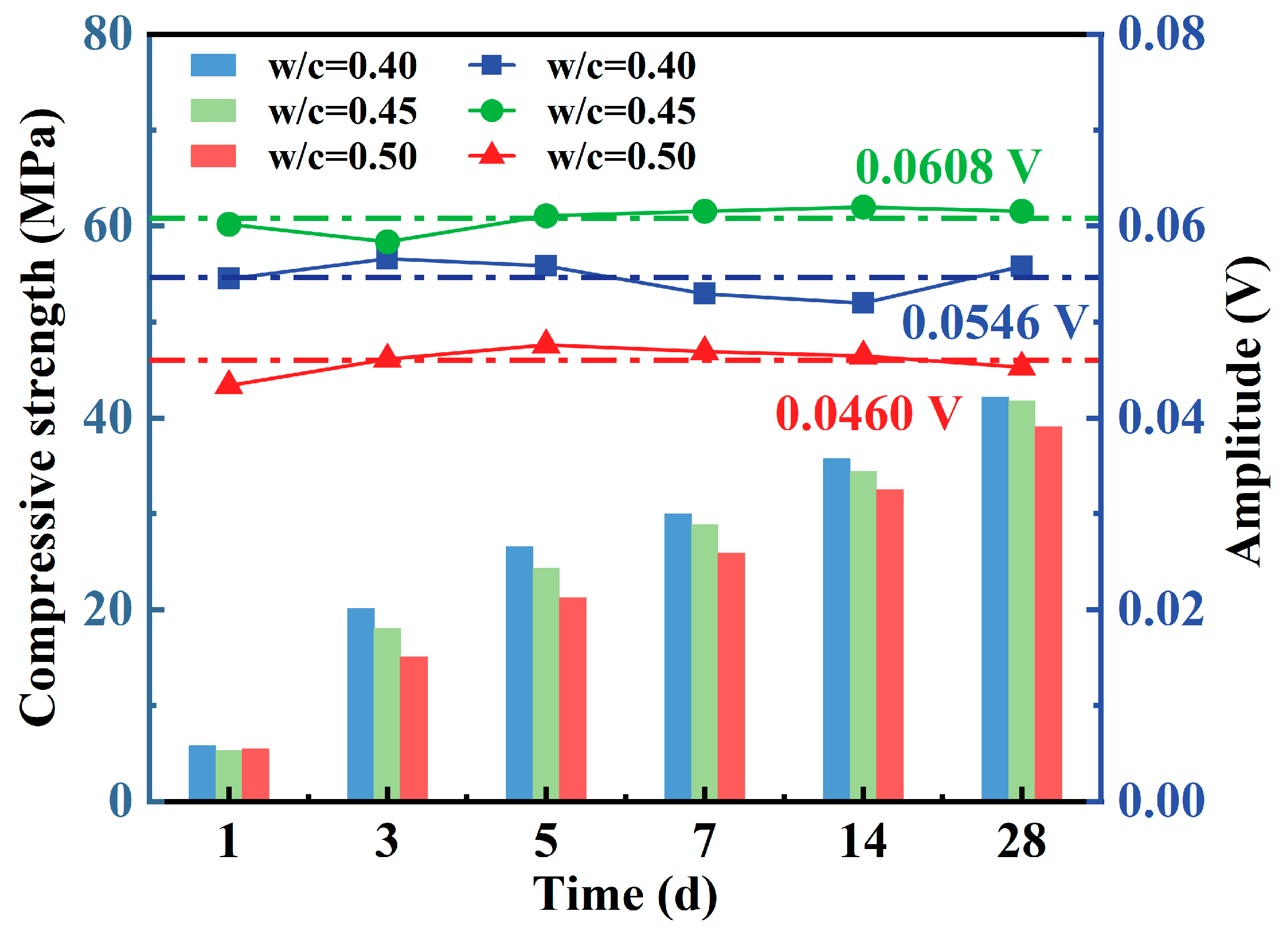 Time (h) | Compressive Strength (MPa) | Amplitude (V) | ||||