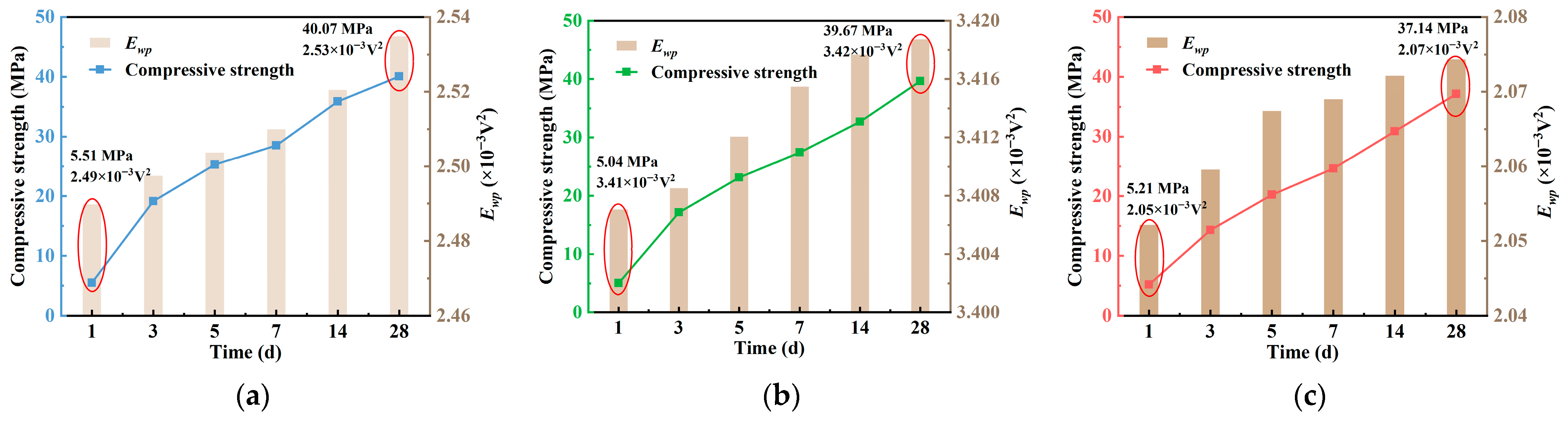 - From 1 to 28 d, the signal amplitude exhibited a gradual increase with slight fluctuations, ranging from 0.0460 to 0.0608 V. However, WPE was more sensitive to the densification process, effectively reflecting the internal microstructural reconstruction driven by hydration. Based on the measured WPE values, the w/c = 0.45 group consistently exhibited the highest and most stable energy values across all curing ages, suggesting relatively better structural uniformity. In contrast, specimens with higher w/c ratios showed lower energy responses, which can be attributed to higher porosity and increased signal attenuation.