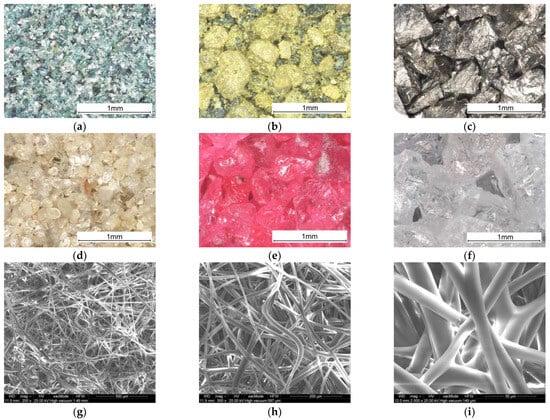 Microscope images of the powders used (×150) and the thermoplastic non-woven fabric (×200, ×500, ×2000): (a) silicon carbide green; (b) glauconite; (c) stainless-steel shot; (d) quartz sand; (e) chromium electro-corundum; (f) white electro-corundum; (g–i) thermoplastic non-woven fabric.