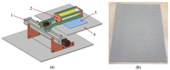 (a) Schematic of the powder layer spreading device (1. linear drive; 2. powder feeder; 3. formed powder layer; 4. base of the thermo-transfer press); (b) formed powder layer.