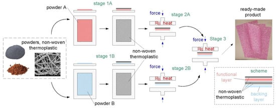 The first stage consists of spreading a layer of powder on a flat surface (Figure 3b), laying down the thermoplastic non-woven fabric and then welding under pressure with a REV 3S thermo-transfer press from ”Transmatic” (Lazzate, Italy) equipped with digital control of both temperature value and welding time.
