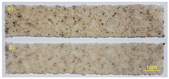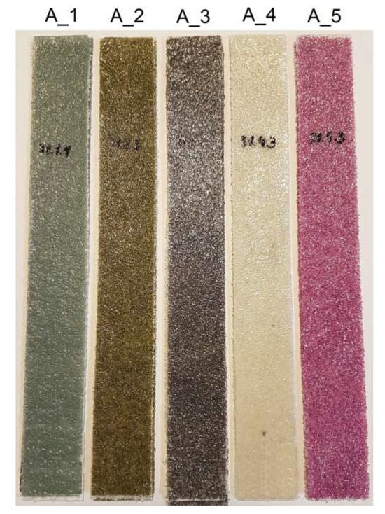 This wide variety of powders used in terms of grain size, type and colour was chosen deliberately for three key reasons. The first, and most important, is to test the capabilities of the new original device shown in Figure 3a. The device was designed to be universal in terms of a wide range of grain sizes. The second reason is to test whether the thermoplastic non-woven copolyester, the grammage of which was selected as a result of technological trials, would be able to be used independently of the type of powder material. The third reason, which is significant from an aesthetic point of view, is the final colour effect of the resulting prepreg, which is planned for use on the surface of, for example, façade composite panels.