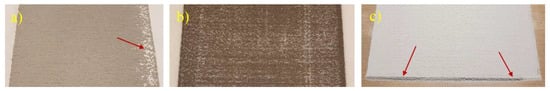 Defects during the spreading of the powder layer: (a) one-sided cavities; (b) uniform defects covering the entire sheet; (c) excessive powder at the beginning and end of the layer, resulting from the delayed movement of the feeder.