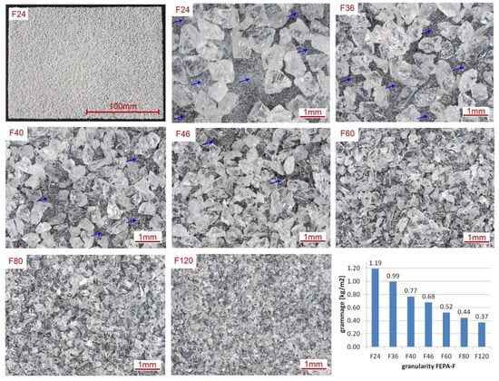 The manufactured sheets represent stage 2B, as shown in Figure 4. The grammage of the BL decreases as the grain size of the electro-corundum powders used decreases and is in the range of 1.19 kg/m2 to 0.37 kg/m2. As the manufacturing of the PCs was performed for the first time, the highest grain size of F24 (0.745 mm) alumina was used for their fabrication. However, if we analyse the microscopic images in Figure 7, the phenomenon of incomplete coverage of the thermoplastic non-woven by the grains can be seen. The arrows indicate the more extensive areas where copolyester is visible.