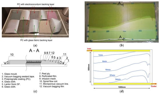 Vacuum infusion process: (a) PC placement on glass plate; (b) resin flow for 16 min; (c) view of layers; (d) time course of infusion.