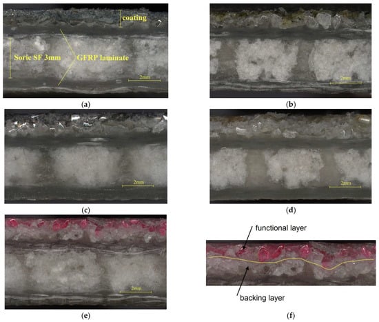 In Figure 9f, due to the colour difference, the white electro-corundum BL, which bonds to the resin during infusion, and the FL (pink colour), which is visible from the outside of the composite, can be easily distinguished. The resulting coatings are consistent with no voids or cracks. Furthermore, their thickness is uniform along the entire length of the composite. This is due to the fact that thermoplastic non-woven fabric has a uniform thickness and appropriate grammage, and during its melting in processes 2A and 2B, as shown in Figure 4, only one layer of powder grains can be bonded. Table 3 collects the average results of the thickness measurements of the composites taken at 15 points, together with the specified deviation. Although the thickness deviation is larger than for the reference specimens without PC, it is still at a low level in the range of 0.05 mm to 0.09 mm. For most applications, such a deviation is visually imperceptible and does not adversely affect the properties of the product.