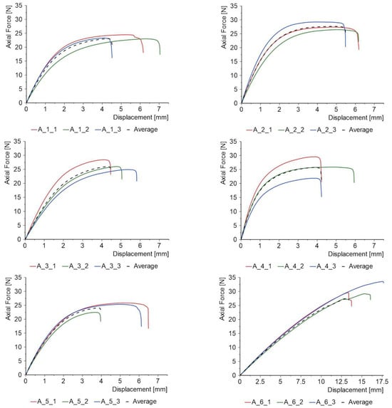 Tensile tests of the PC and 3-PB tests were carried out on a Zwick/Roell testing machine with a range of up to 2.5 kN, and adhesion tests were carried out on an MTS 100 kN machine. The tests were conducted statically with a constant displacement of 1 mm/min. Photographs of the specimens mounted on the strength testing machines are shown in Figure A3 in the Appendix. A digital image correlation system, “Aramis” (Carl Zeiss, Oberkochen, Deutschland GmbH), was also used in the tests to observe deformations and determine elastic constants for the PC. The force–displacement graphs were performed using Diadem 2019 software.