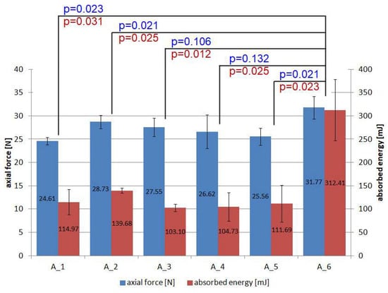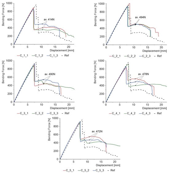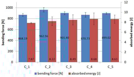 - Three-point bending tests have shown that the one-sided application of PC results in a decrease in maximum force of approximately 9.77% compared to reference specimens without PC. This result was achieved for the C_1 batch with silicon carbide as the FL. The large advantages of using PC appear at the bending stage after the maximum force has been reached. PC makes the absorbed energy higher, and also the force drops by about 45% to 52% from the maximum value. For reference specimens, the decrease in force after the maximum value is as high as 69%;