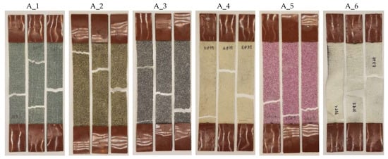 Powders 1, 3, and 4 and white electro-corundum were sourced from the “Rewa” company (Nowy Redzeń, Poland). Glauconite is a natural mineral and comes from the Lublin area (Poland), as does the quartz sand used. The thermoplastic non-woven fabric was produced by ”TMBK Partners” (Warsaw, Poland).