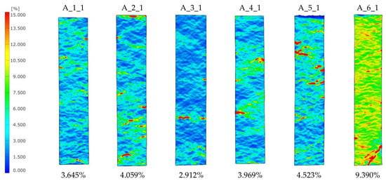 Figure 8a shows 10 PC sheets with an electro-corundum white backing layer and glass fabric. In this study, only the results for the PC with the white electro-corundum backing layer will be discussed.