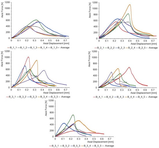 The thickness of the PC, shown in Table 2, has been calculated as the average of 11 measurements along the length of the specimens at a distance of 250 mm. The PC is a new product; therefore, it is important to comment on the thickness deviations obtained. If the results are expressed as a percentage, then the range of thickness deviations for the PC obtained is in the range of 3.73% to 7.02%. This type of material has no equivalent in the literature; however, considering epoxy–carbon prepregs, as in the work of [], then a range of 0.99% to 3.96% was obtained. It should be noted that the new PCs presented in this work are based on grains that are not themselves regular and, for each grain size, fall within a certain size range. In contrast, the epoxy–carbon prepregs only have reinforcement fibres and a polymer matrix. Hence, the presented range of percentage deviations from the average thickness should be considered very good, as the lower value of 3.73% is close to the upper range of 3.93% for professional prepregs.