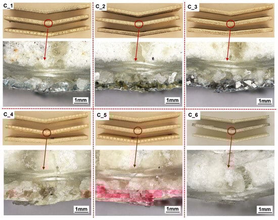 For the “sandwich” composites, observations were made on a Keyence VHX-970F (Osaka, Japan) microscope, which allowed the thickness of both the coatings and the entire composite to be measured (Figure 9).