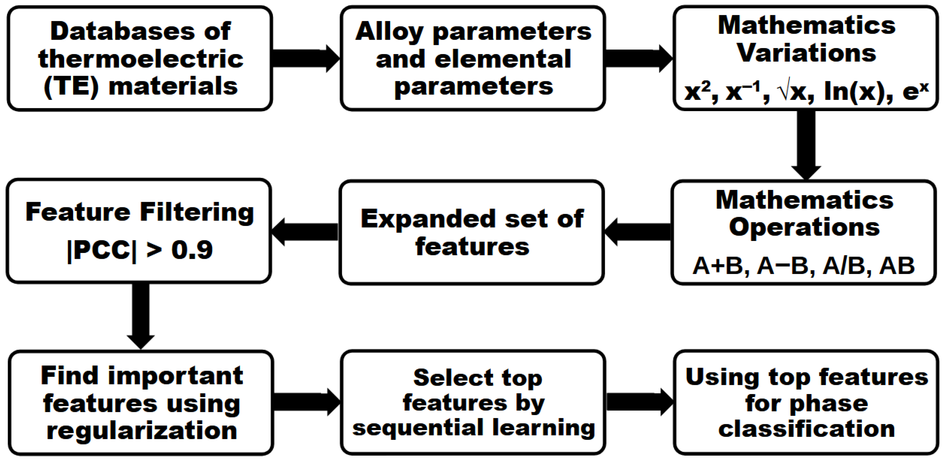 - Vaitesswar, U.S.; Bash, D.; Huang, T.; Recatala-Gomez, J.; Deng, T.; Yang, S.W.; Wang, X.; Hippalgaonkar, K. Machine learning based feature engineering for thermoelectric materials by design. Digit. Discov. 2024, 3, 210–220. [Google Scholar] [CrossRef]