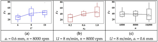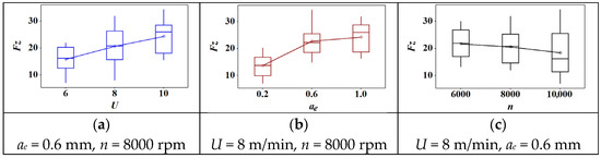 The box plot of cutting parameters versus tangential force is shown in Figure 3. Firstly, there were no outliers in each graph. Second, the mean value of tangential force increased with the increase of feed speed and cutting depth. However, the tangential force presented a decreasing trend with the increase of rotation speed. Furthermore, the increasing trend of tangential force was stable under the condition of increasing feed speed in Figure 3b. However, the tangential force showed a sharp increase when the cutting depth increased from 0.2 mm to 0.6 mm. Then, it showed an almost horizontal trend when the cutting depth continued to increase. In contrast, the tangential force presented a sharp decreasing trend when the rotation speed increased from 6000 r/min to 8000 r/min (Figure 3c). Then, it showed a slightly decreased trend when the rotation speed continued increasing to 10,000 r/min. Overall, a shallow cutting depth (0.2 mm) and a higher rotation speed (8000 r/min) can effectively decrease the tangential force.