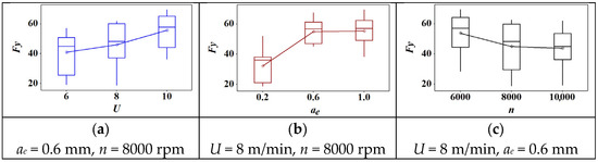The box plot of cutting parameters versus lateral force is shown in Figure 4. Firstly, there were no outliers in each graph. Second, the mean value of lateral force increased with the increase of feed speed and cutting depth. Similarly, the lateral force showed a decreasing trend when the rotation speed increased. As shown in Figure 4a, the lateral force showed a near-linear growth with the increase of feed speed. However, it first showed a sharp increase when the cutting depth increased from 0.2 mm to 0.6 mm. Then, it showed a slight increase when the cutting depth reached 1.0 mm. When the rotation speed increased from 6000 r/min to 10,000 r/min, the lateral force presented a slightly decreasing trend. In general, cutting depth has the greatest effect on lateral force among these parameters. In other words, only a shallow cutting depth can effectively decrease the lateral force.