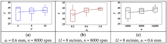 Generally, cutting temperature T increases with U and ae and also increases with n over the tested range. The growth with n occurs despite the reduction in forces, which indicates that frictional heating at a higher sliding velocity dominates the temperature field near the tool–chip interface.
