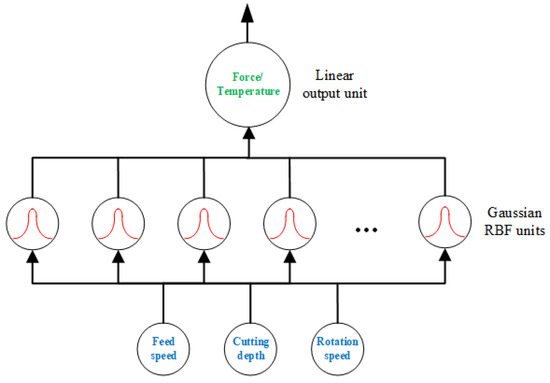 The framework of the RBF model for cutting force and temperature is shown in Figure 6. The input parameters were set as feed speed, cutting depth, and rotation speed. The output parameters were set as resultant cutting force and cutting temperature separately [30,31,32]. There were 27 groups which contained 21 groups for training data (approximately 80%), three groups for validation data (approximately 10%), and three groups for test data.