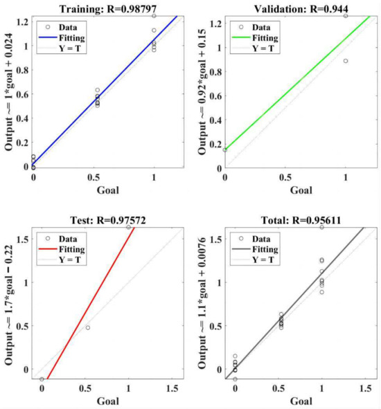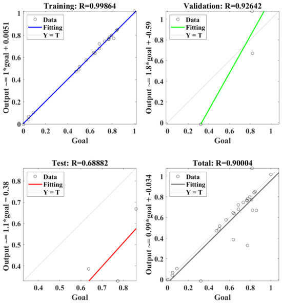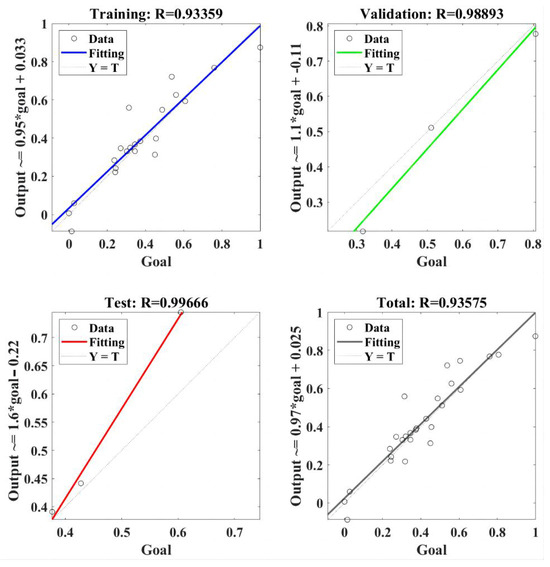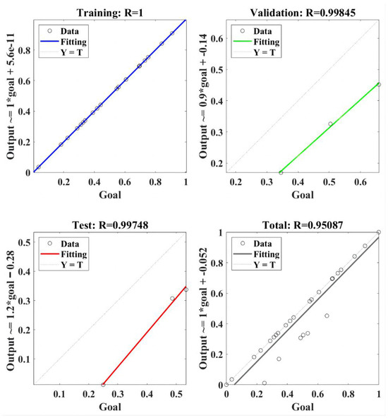 The regression model of RBF-NN for the tangential force is presented in Figure 8. The RBF-NN model was trained using selected data, and the value of correlation coefficient R was 0.99915. It indicated that the trained RBF-NN model can effectively present a positive relation between goal and output. Furthermore, R values of 0.85217 and 0.95773 were obtained in the validation and test, respectively, of the trained RBF-NN model [34], both of which verify the effectiveness of the trained RBF-NN model for tangential force. Finally, the total performance of the trained RBF-NN model for the tangential force obtained an R value of 0.87495, which means the value of goodness of fit reached about 0.765. In summary, the trained RBF-NN model can fit and predict tangential force well, and the goodness of fit is about 76.5%.
