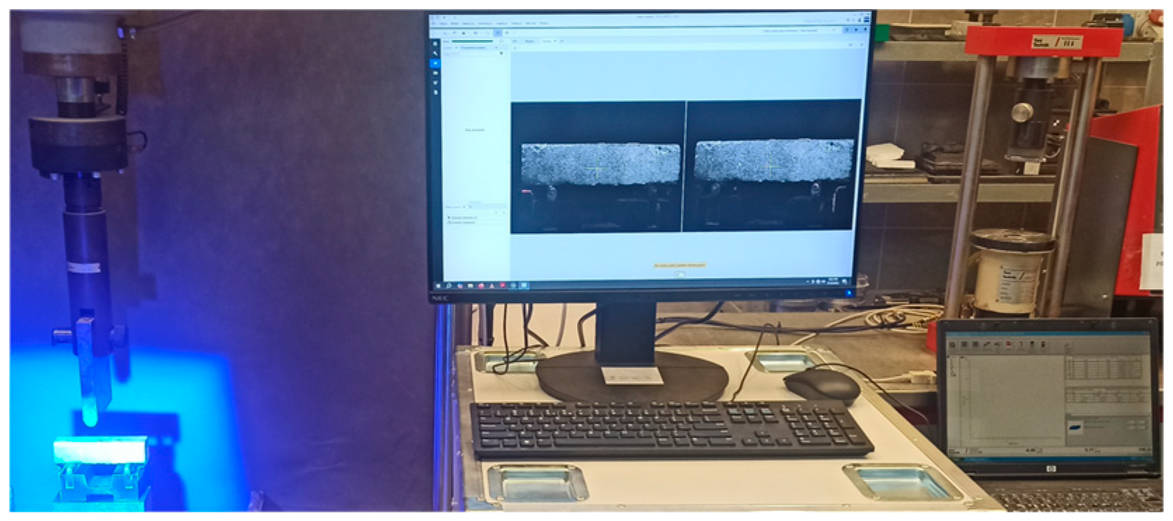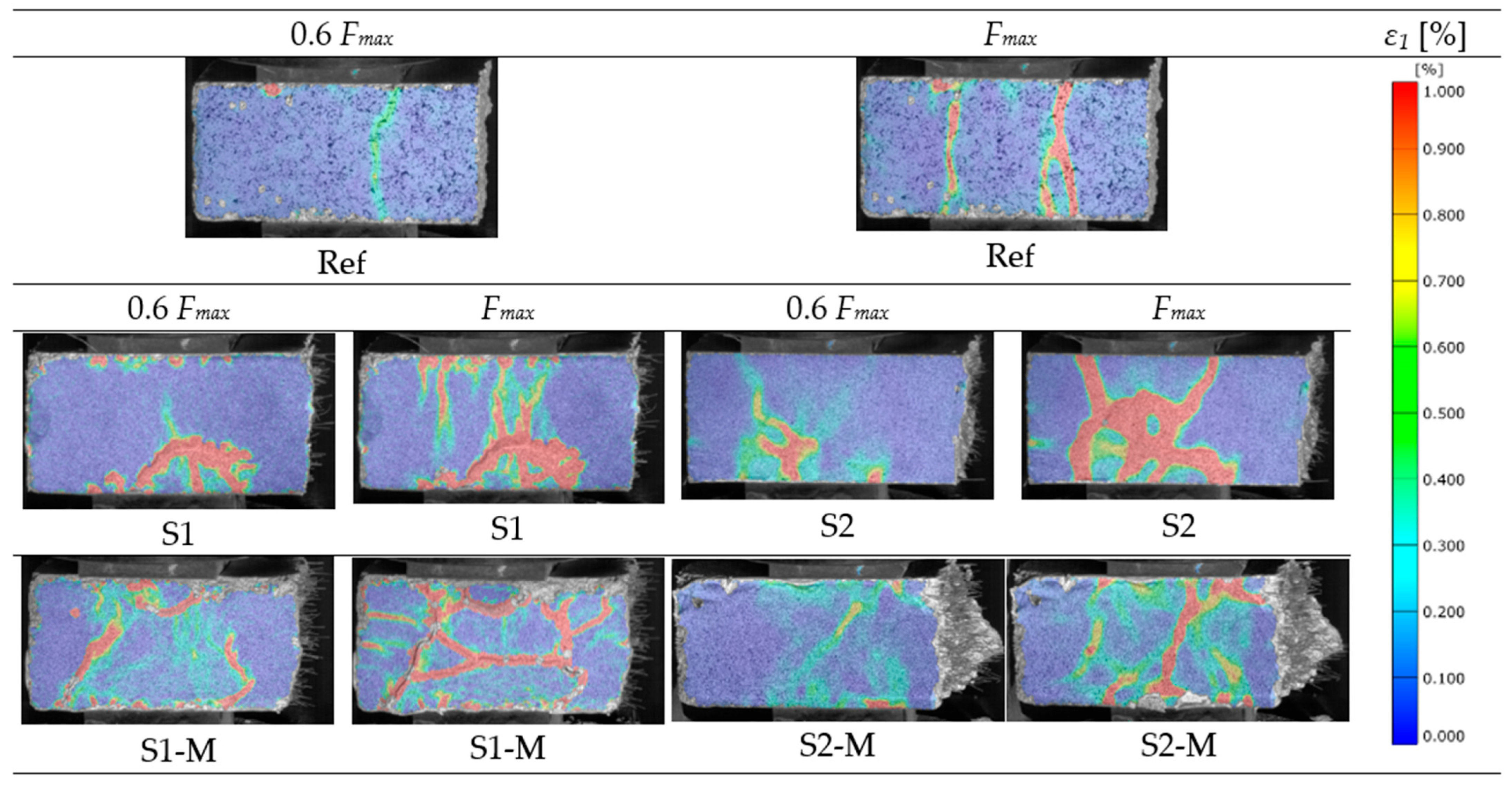 - The use of magnetic field for the orientation of fibers changed the strain fields, as confirmed in the analysis of the ε1 principal tensile strain map created with the DIC method use in the flexural performance test. Multiple, skew bands were registered for the S-M type specimens instead of thin, singular bands noted for other beams. Singular (one or two) bands, parallel to the loading direction, dominated in the case of the reference specimens (without fibers) submitted to compression tests, while a net of wide-spread, skew (in reference to loading direction) bands was noted for specimens with magnetically oriented fibers.