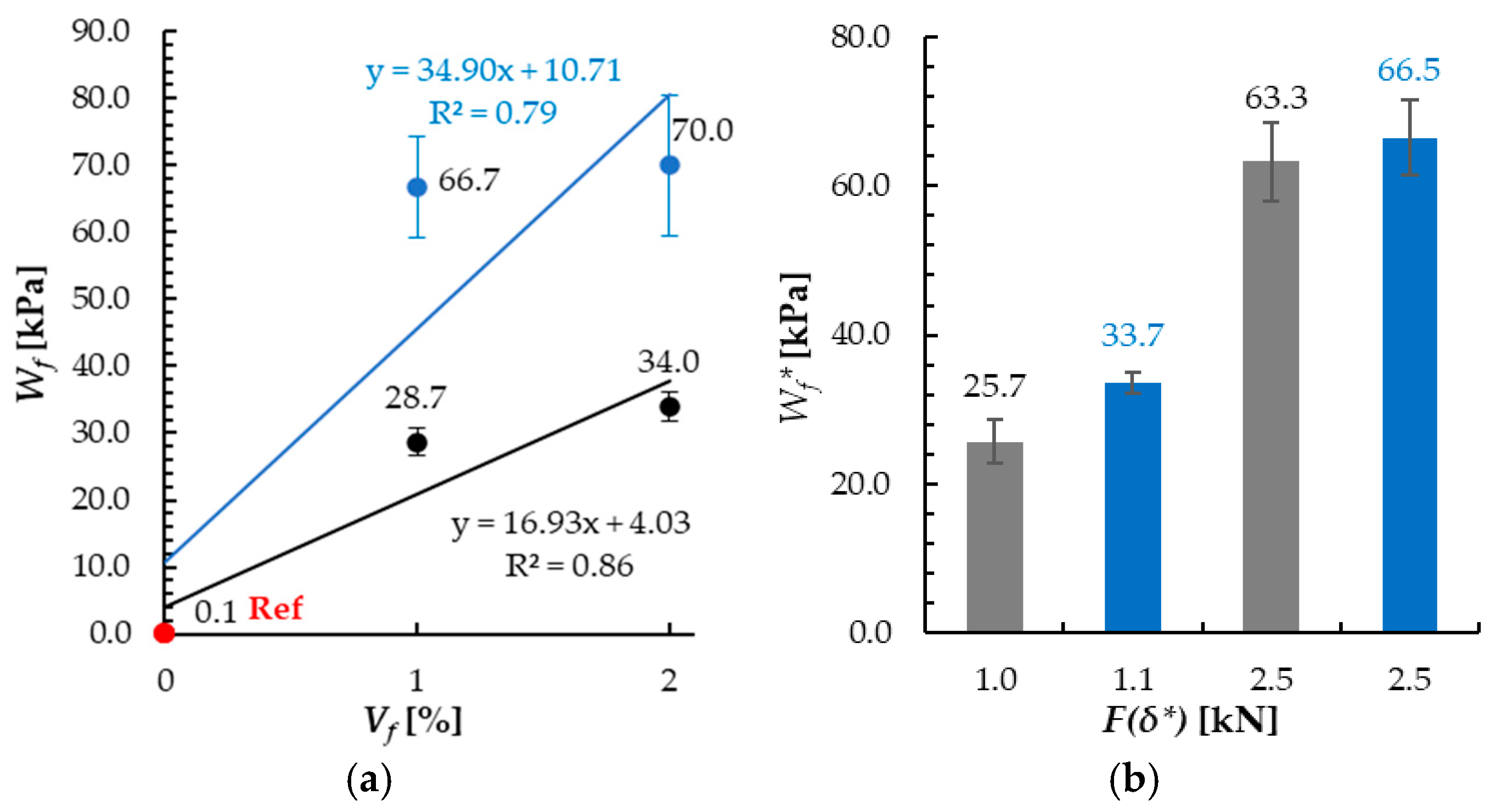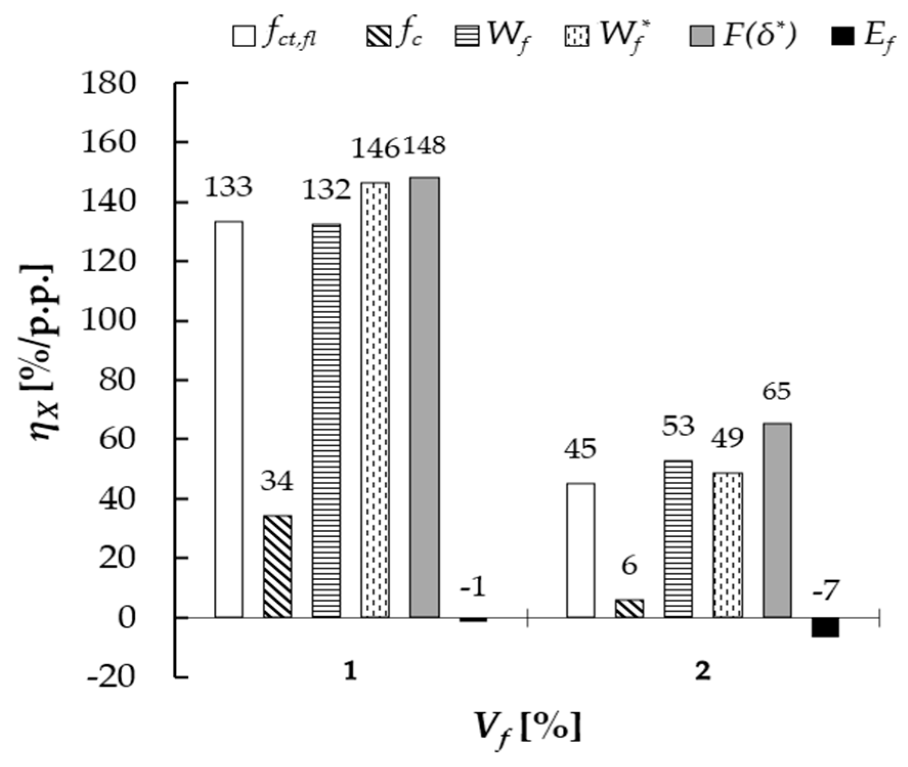 - Based on the efficiency factor (ηX) values (Figure 10), the positive influence of fibers’ magnetic orientation was confirmed. The highest influence was demonstrated for the residual force value F(δ*), fracture work (Wf*) and flexural tensile strength (fct, fl); moderate for compressive strength (fc) and marginal for the effective elastic modulus (Ef). The magnetic orientation beneficial effect was higher for Vf = 1% than for Vf = 2%.