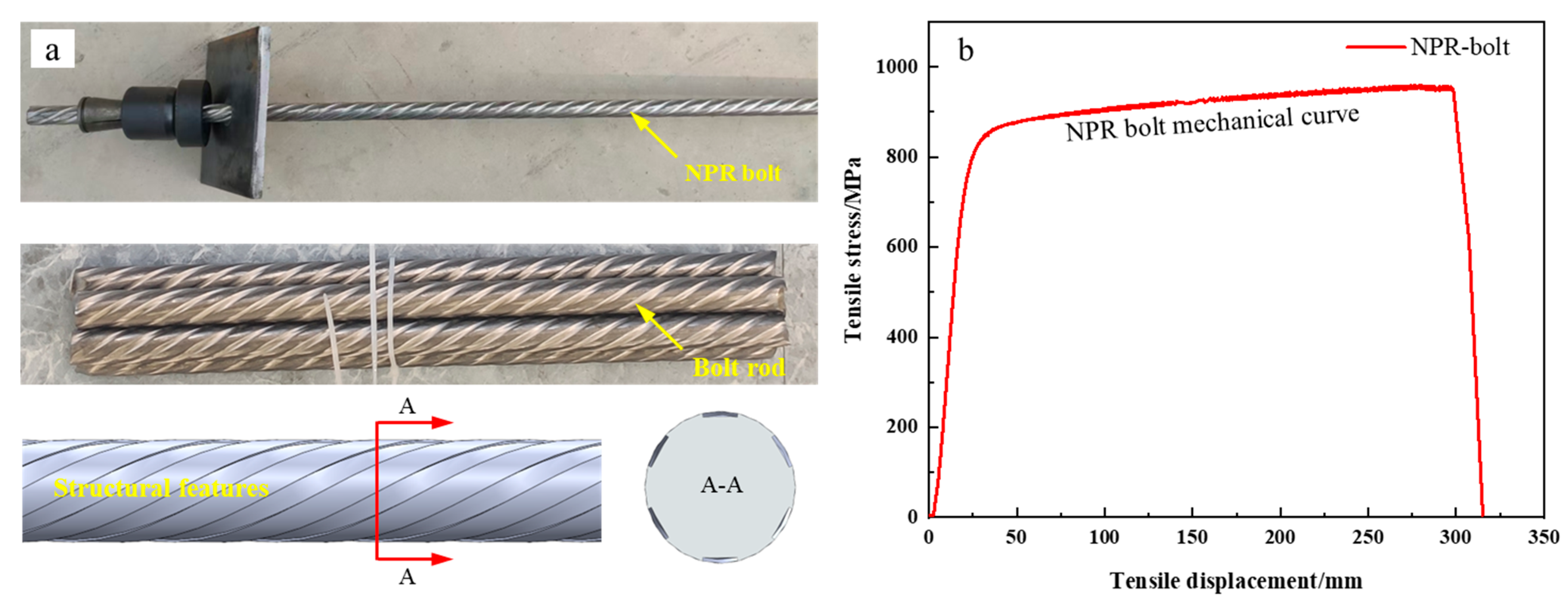 - Zhan, J.; Yang, J.; Bian, W.; Zhao, R.; Dong, M. Analytical study and engineering application of NPR prestressed bolt is anchored by mechanical-type anchorage and resin. Tunn. Undergr. Space Technol. 2024, 145, 105616. [Google Scholar] [CrossRef]