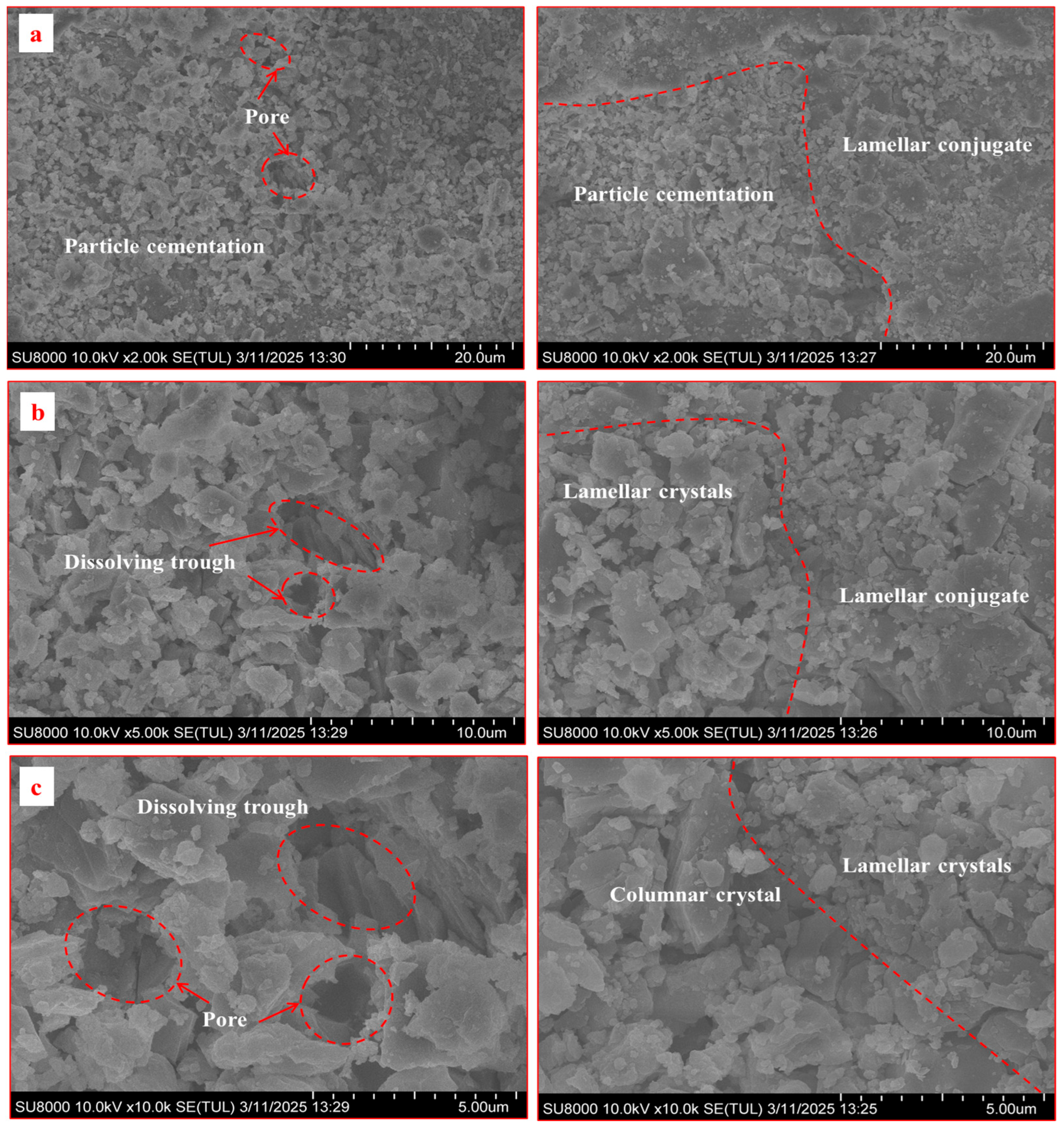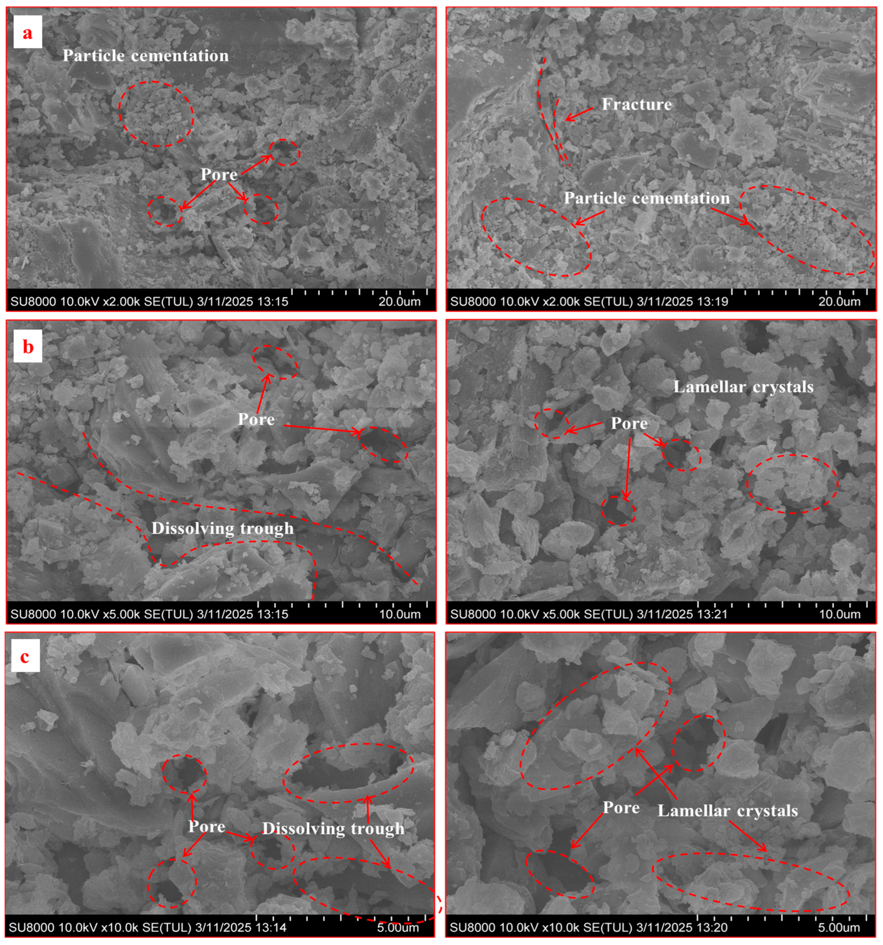 - This work provides new mechanistic insights. We established a clear link between the improved macroscopic performance (i.e., strength retention and interfacial durability) and the material’s microstructure. The evidence shows that the improved formulation maintains its structural integrity by suppressing the initiation and propagation of microcracks at the resin–rock interface, which is a critical failure mechanism.