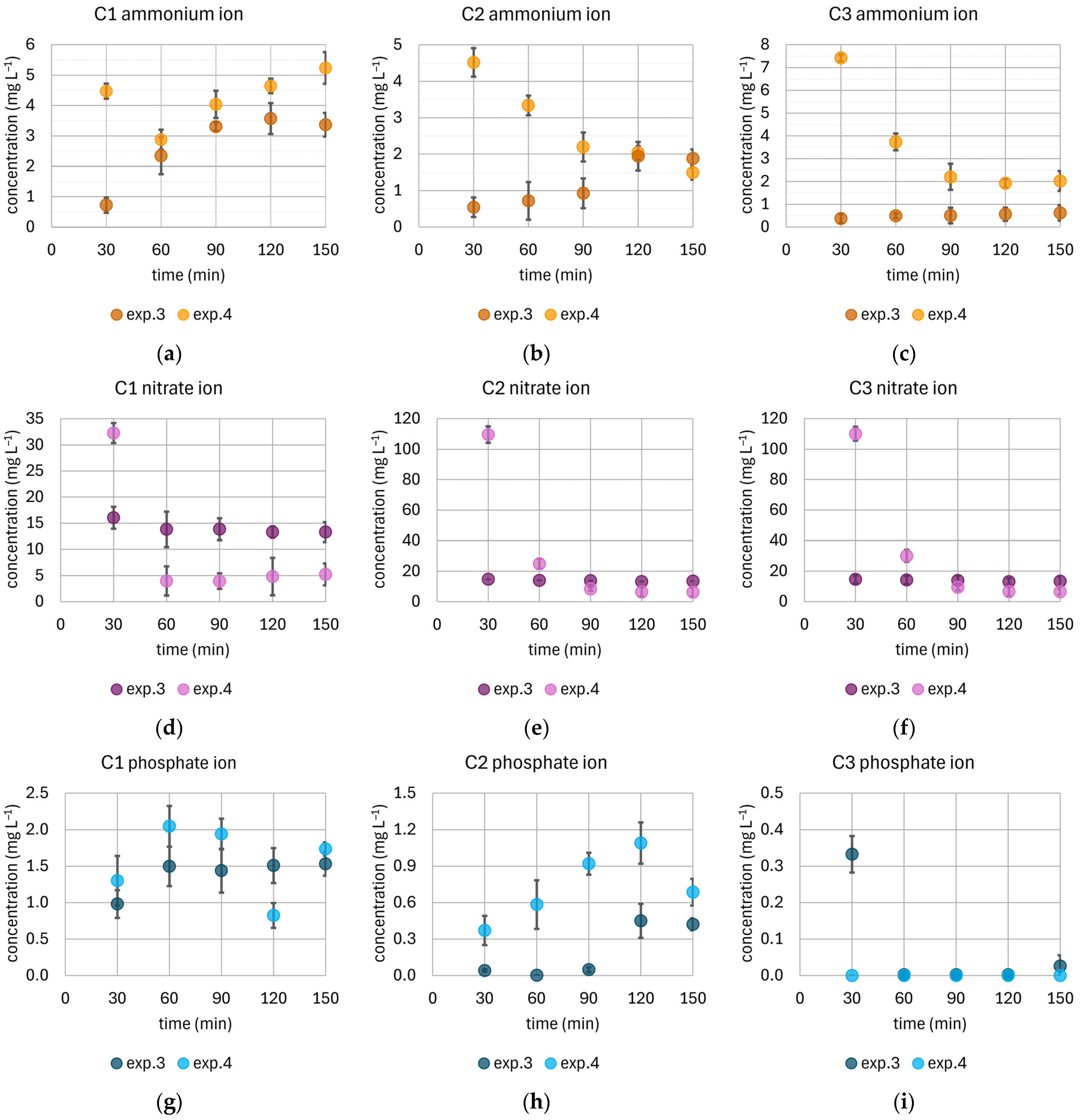 - In the experiments with high-intensity rain (exp.1: 310 mL min−1), no removal was observed; on the contrary, NO3− concentrations in the effluents were higher than those in synthetic rain. In the column without diatomite, the NO3− concentration increased by approximately 11% on average. The columns with diatomite, i.e., C2 and C3, also did not remove NO3−, and the increase in concentration was even greater: approximately 22% and 15%, on average, for C2 and C3, respectively.