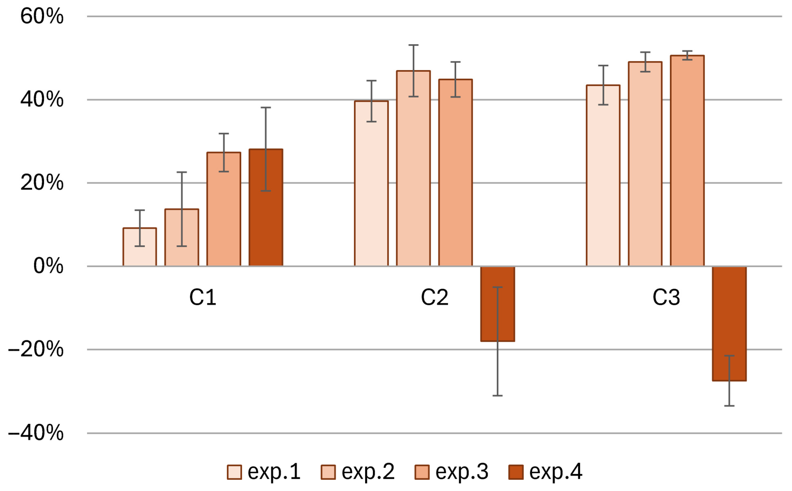 - Moderate (from 30 to 60%) for phosphorus (C1, exp.1 and exp.3) and nitrogen (C2 and C3, exp.1–3);