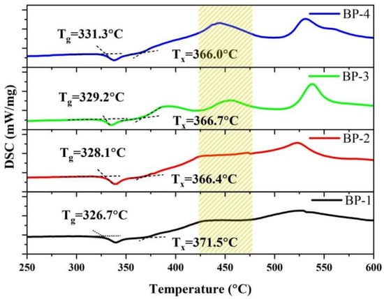 To verify the changes in the macroscopic stability of the glasses, we obtained the thermodynamic characteristic temperatures of the series of bismuthate glasses using a differential scanning calorimeter (DSC), as shown in Figure 2. The glass transition temperature (Tg), onset crystallization temperature (Tx), and thermal stability parameter (ΔT = Tx − Tg) of optical glass are crucial thermal performance indicators that indirectly measure the microscopic chemical bond strength, as well as the macroscopic thermal shock resistance and thermal processing performance of the glass [27]. As Pb3(BO3)2 is gradually replaced by PbO, the Tg of the glass increases gradually from 326.7 °C to 331.3 °C, while the Tx decreases from 371.5 °C to 366.0 °C. The thermal stability parameter of the glass gradually decreases from 44.8 °C to 34.7 °C, which is consistent with the variation trend of the physical parameters. Meanwhile, as the crystallization tendency of the glass intensifies, a new exothermic peak appears near 450 °C. This indicates that a further increase in PbO content leads to a change in the type of crystals precipitated from the glass.