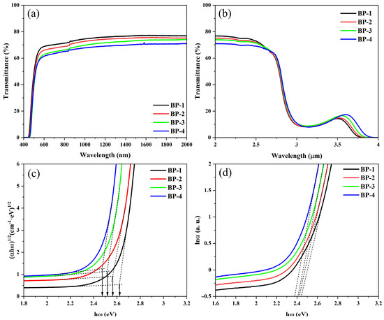 The spectral properties of the series of glasses are shown in Figure 3; all glass samples exhibit high transparency in the visible and near-infrared regions, except for an absorption peak caused by hydroxyl groups (OH−) in the range of 2.9–3.5 μm [28]. Among these samples, the BP-1 glass with a thickness of 5 mm achieves a maximum transmittance of 77%. As Pb3(BO3)2 in the series of samples is gradually replaced by PbO, the refractive index of the glass increases incrementally, leading to a gradual rise in the Fresnel reflection of the glass. Consequently, the overall transmittance of the glass decreases progressively. Meanwhile, as the content of B2O3 in the glass gradually decreases, the maximum phonon energy of the glass decreases incrementally, which broadens the infrared transmission range of the glasses. This can be confirmed by the slight red shift in the samples’ infrared cut-off wavelength.
