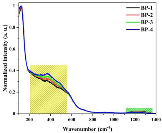 To analyze the structural changes in the glasses, Raman spectroscopy was used for characterization. Figure 4 shows the normalized Raman spectra of this series of glasses, which mainly consist of three vibration bands with their central peak positions at 114 cm−1, 370 cm−1, and 1220 cm−1. The vibration band at 114 cm−1 is attributed to the vibration of Pb-O covalent bonds and the Bi-O vibrations in bismuth oxide polyhedra. The vibration bands near 370 cm−1 and 1220 cm−1 are mainly associated with the Bi-O-Bi stretching vibration of [BiO6] octahedral units, the vibration of [BO4] tetrahedra, and the B-O-B stretching vibration of [BO3] pyramids, respectively [32]. As Pb3(BO3)2 is gradually replaced by PbO, the intensity of the vibration band at 370 cm−1 increases gradually, while that at 1220 cm−1 decreases. This is attributed to the gradual decrease in the content of B2O3 in the glass network, which leads to a gradual reduction in the proportion of B-O-B linkages during the formation of the glass network and a gradual increase in the content of [BiO6] octahedra.