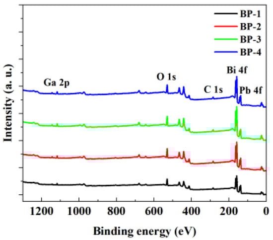 X-ray photoelectron spectroscopy (XPS), when combined with Raman spectroscopy, serves as a powerful tool to determine the effect of component variations on the structure of magneto-optical glasses and explore the intrinsic mechanism underlying the changes in the magneto-optical properties of glass samples. The XPS survey spectra in Figure 5 shows the presence of abundant Bi 4f, Pb 4f, O 1s, and Ga 2p peaks in the glasses. It can be observed that the signals of Bi 4f and Pb 4f increase as Pb3(BO3)2 is gradually replaced by PbO.