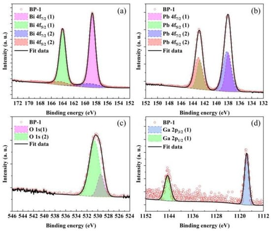 Deconvolution high-resolution XPS profiles of (a) Bi 4f, (b) Pb 4f, (c) O 1s, and (d) Ga 2p core-level spectra of BP-1 glass.