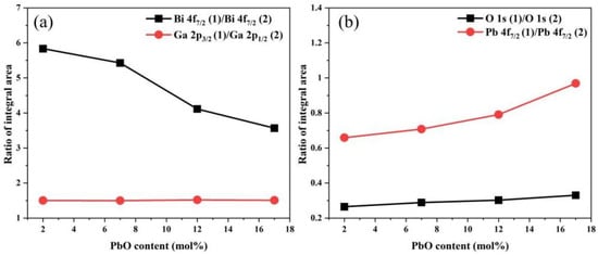 Variation in the high-resolution XPS integral area ratio of (a) Bi, Ga and (b) O, Pb as a function of PbO content.
