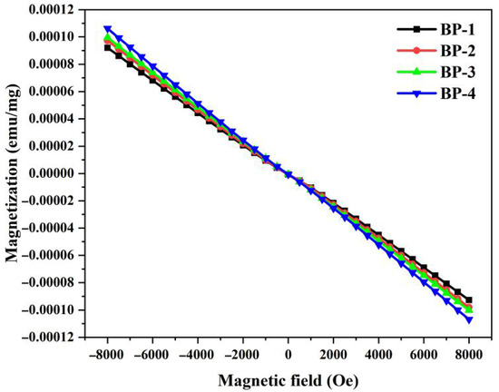 Figure 8 shows the hysteresis loops of samples measured at room temperature. All these investigated bismuthate glass samples exhibit typical diamagnetic characteristics, and no magnetic susceptibility loops are observed. As Pb3(BO3)2 is gradually replaced by PbO, the magnetization of the samples increases progressively. Magnetic susceptibility (χ) is an indicator used to measure the ease with which glass materials can be magnetized by a magnetic field. Based on the hysteresis loops of the samples, with the increase in the number of samples and the content of lead monoxide (PbO), the magnetic susceptibilities of the glasses are −11.55 × 10−6 emu/g, −12.21 × 10−6 emu/g, −12.49 × 10−6 emu/g, and −13.32 × 10−6 emu/g, respectively. The magnetic properties of any material originate from the magnetic moments of individual atoms and the change in orbital momentum induced by an external magnetic field contributes to diamagnetism [39]. Diamagnetism is proportional to both the number of electrons and the square of the orbital radius of closed electron shells [40]. In the BP series glasses, bismuth mainly exists in the valence states of Bi3+ and Bi5+. The electron configurations of both valence states have no unpaired electrons, so both exhibit diamagnetism. Similarly, lead, gallium, and boron also exhibit diamagnetism. The Pb2+ ion has two electrons in its outer shell, corresponding to an electron configuration of 6s2. Consequently, it exhibits a strong s2-sp electronic transition amplitude, involving transitions from the 1S0 energy level to the 1P1, 3P0, 3P1, and 3P2 energy levels. Studies have shown that in certain types of oxide glass systems, such transitions result in a relatively strong diamagnetism [14]. According to Pascal’s method and the theoretical magnetic susceptibility of diamagnetic ions, the order of the contribution of each cation to diamagnetism in BP glasses is χPb > χBi > χGa> χB [24]. Therefore, as the content of B2O3 in the glass gradually decreases, the diamagnetic susceptibility of the samples gradually increases.
