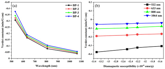The Verdet constants of the samples at different wavelengths are presented in Figure 9 and Table 4. To verify the reliability of the system, we selected fused silica glass as a standard sample. Its Verdet constant at a wavelength of 633 nm is −0.013 min·G−1·cm−1, which is essentially consistent with the results reported in reference [41]. According to previous studies, the Verdet constant is often proportional to the refractive index of glass [42]. For the BP series glasses, the replacement of B3+ by Pb2+ leads to a gradual increase in the glass’s optical basicity, oxygen ion polarizability, and refractive index, which ultimately results in a gradual increase in the glass’s Verdet constant. As shown in Table 5, under the condition of ensuring the stability of the glass, the Verdet constant of BP-4 glass at 633 nm can reach −0.191 min·G−1·cm−1, which is higher than some diamagnetic oxide glass. Furthermore, it is found that the Verdet constants at various wavelengths exhibit almost a linear relationship with the diamagnetic susceptibility of the studied glass. This implies that the Verdet constant of the glass can be directionally enhanced by introducing more components with high diamagnetic susceptibility into the glass.