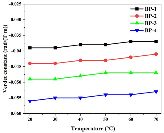 To clarify the temperature dependence, the Verdet constants of the glass samples at 1064 nm were measured under different temperatures; the results are presented in Figure 10 and Table 6. It can be observed that when the temperature increases from 20 °C to 70 °C, the Verdet constant of the bismuthate glass remains almost unchanged, and its slope coefficient is less than 0.4 × 10−5 K−1 at 1064 nm. Compared with Tb-doped aluminosilicate glass (−8.9 × 10−4 K−1 @ 635 nm, −2.6 × 10−4 K−1 @ 980 nm), the absolute value of the slope is two orders of magnitude lower [16]. This indicates that novel diamagnetic glass can operate in more complex environments to ensure the stability of high-power laser systems.