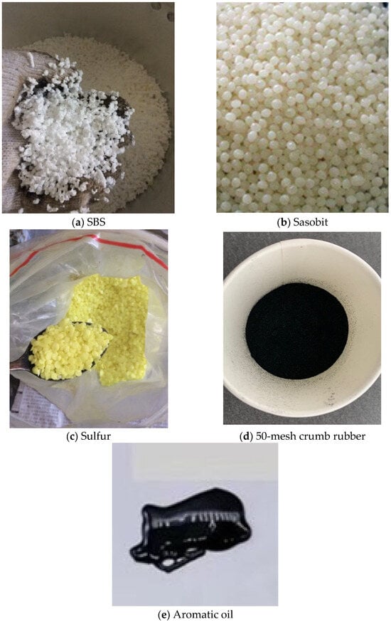 To prepare Sasobit–SBS composite-modified asphalt and enhance its low-temperature crack resistance, five additives were used in this study, namely Sasobit, SBS, sulfur, crumb rubber, and aromatic oil, as shown in Figure 1.