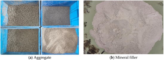 For each prepared modified asphalt formulation, corresponding mixtures were produced to evaluate the high-temperature performance, low-temperature crack resistance, moisture resistance, and fatigue performance of the composite-modified asphalt mixtures. The mixtures were designed using a dense-graded AC-13 gradation. The detailed gradation results are shown in Table 2. Aggregates were divided into four size categories: 0–3 mm, 3–5 mm, 5–10 mm, and 10–15 mm. Basalt was used as the coarse aggregate, limestone as the fine aggregate, and limestone powder as the mineral filler, as illustrated in Figure 2. The mixtures were designed using the Marshall method, resulting in optimum asphalt contents of 3.98%, 4.08%, 4.67%, and 4.03% for the four formulations, respectively.