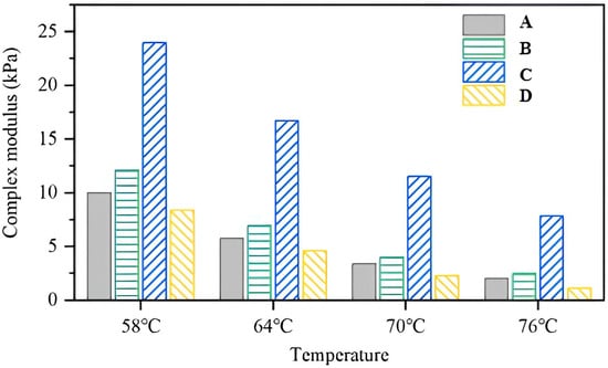 The complex modulus (G*) results obtained from the DSR time sweep test are presented in Figure 3. As the temperature increased, the complex modulus of all asphalt formulations decreased, with the rate of decline gradually slowing and the differences in modulus between temperature intervals becoming less pronounced. As can be seen from the figure, among the four formulations, the complex modulus of formulation C is the least sensitive to temperature changes, indicating superior performance at both high and intermediate temperature ranges.