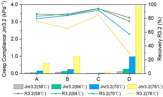 In this study, MSCR tests were conducted on various composite-modified asphalt formulations to evaluate their high-temperature performance. All samples were conditioned using the Rolling Thin-Film Oven Test (RTFOT) method. A modified MSCR calculation method was employed to determine the percent recovery (R3.2) and non-recoverable creep compliance (Jnr3.2) of the SBS-modified asphalt at a stress level of 3.2 kPa. The related test results are summarized in Figure 4.