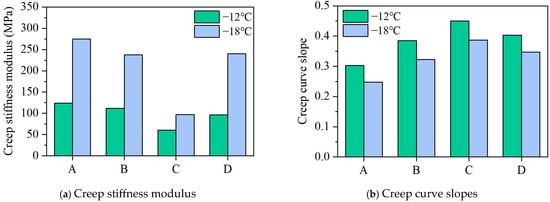 Under normal conditions, higher asphalt stiffness leads to greater internal thermal stress and reduced low-temperature performance. In the Bending Beam Rheometer (BBR) test, the creep rate (m) reflects the asphalt’s stress relaxation capacity, with a higher creep rate indicating a stronger ability to relieve thermal stress under low-temperature conditions. According to the SHRP study, the creep stiffness (S) and creep rate (m) at 60 s are considered key control parameters for evaluating low-temperature performance. The results of the BBR test are presented in Figure 5.