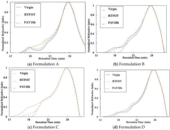 GPC provides an effective means to monitor polymer degradation during the aging process of polymer-modified asphalt, while also revealing the growth of high-molecular-weight fractions in the base asphalt. Variations in molecular weight at the microscopic scale across different aging stages reflect changes in the composition of the asphalt system. Accordingly, GPC analyses were conducted on original, RTFOT-aged, and 20 h PAV-aged SBS-modified asphalt, as well as on various composite-modified asphalt formulations. The resulting chromatograms are presented in Figure 6.