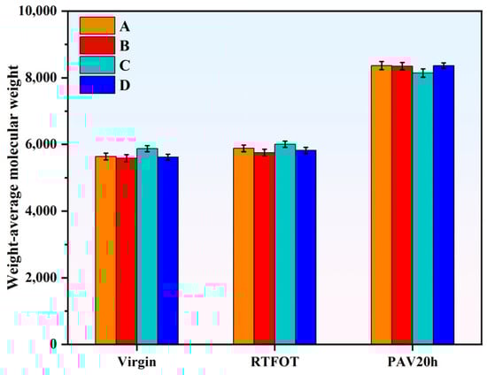 The anti-aging properties of the composite-modified asphalt were analyzed using the GPC test. It offers an effective approach for determining the molecular weight and its distribution in polymeric materials and is extensively used to study asphalt aging behavior and the blending state between virgin and aged binders, as aged binders typically exhibit a higher large molecular size (LMS) content. In this study, GPC was employed to characterize the molecular weight distribution of the prepared asphalt. The procedure involved dissolving the asphalt sample in tetrahydrofuran (THF), injecting 1 mL of the asphalt–THF solution into the instrument, recording the chromatogram showing the variation in refractive index with elution time, and calculating the weight-average molecular weight using Equation (1) [34]. Three replicate specimens were prepared for each sample group in the GPC test.