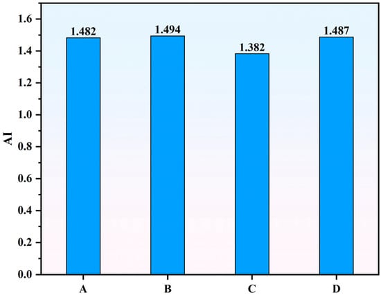 Furthermore, the of the modified asphalt before and after aging were calculated via Equation (1), and the results are shown in Figure 7. The weight-average molecular weight of SBS-modified asphalt and various Sasobit–SBS composite-modified asphalt formulations continuously increases with the degree of aging. This increase in weight-average molecular weight during aging is primarily due to the oxidative aging process, which causes polymer chains and asphalt molecules to undergo oxidation and cross-linking reactions. As a result, smaller molecules combine to form larger molecular structures, leading to an overall growth in molecular weight. Additionally, some degradation products may recombine or polymerize, further contributing to the increase in large molecular fractions. Based on the , the aging resistance index (AI) of the four asphalts was calculated, defined as the ratio of before and after aging—results are shown in Figure 8.