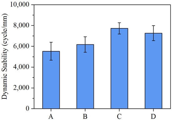 The DS of different asphalt mixtures is shown in Figure 9. ANOVA statistical tests are performed based on the data to determine whether the performance differences among the samples are due to experimental error. It can be seen from the figure that compared to conventional SBS-modified asphalt mixtures, incorporating Sasobit and other additives significantly improved the dynamic stability of the mixtures. ANOVA results confirm that the asphalt formulation has a significant impact on the high-temperature performance of the asphalt mixture. The formulation with aromatic oil exhibited an 11% increase, while the rubber powder-containing mixture achieved the most pronounced enhancement, with a 40% improvement in dynamic stability. The dynamic stability of mixture D was higher than that of mixture A, indicating that the addition of Sasobit can maintain high-temperature performance while reducing the amount of SBS modifier used.
