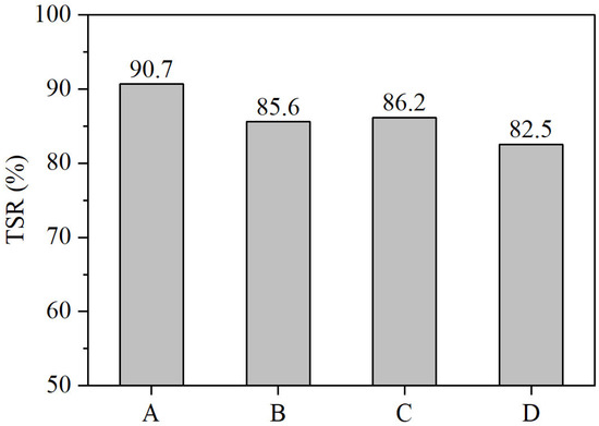 The TSR of different asphalt mixtures is shown in Figure 11. It can be seen from the figure that all Sasobit–SBS composite-modified asphalt mixtures met the specification requirement for TSR (>80%), although their TSR values were slightly lower than those of the SBS-modified asphalt mixtures. Compared to the SBS mixture, the TSR of formulations B, C, and D decreased by 5%, 4% and 8%, respectively.